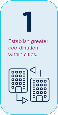 Stronger, more organized city-to-city relationships are required. With so many major cities in the world, costs are high for cities to develop and maintain individual relationships. Networks that facilitate city-to-city coordination offer opportunities to share best practices with each other and learn what works, what does not, and why. Existing networks provide an opportunity to establish city-to-city communications that are both more cost-effective and more inclusive for medium-tier and emerging cities. The networks that have been most successful to date, such as the C40 Cities Climate Leadership Group and 100 Resilient Cities, have focused on research and mobilization around one specific issue. There is opportunity for new institutions that focus less on specific issues and specialize more on providing the mechanisms of city-to-city coordination for whatever major issues arise.