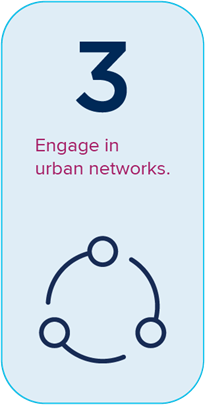 Engage in urban networks. A key point of influence for increased city diplomacy is the power of collective local action on a global scale. On issues such as climate change, trade, and immigration, working together adds credibility and urgency when city leaders want to influence their national governments and international institutions. One mayor trying to persuade a national leader can be ignored; dozens, even hundreds, cannot. This support need not be bound by traditional borders. The challenge is to formalize such collective signaling of interests and preferences by cities so it is recognized by national and international bodies.
