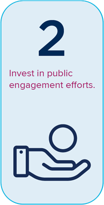 Invest in public engagement efforts. Globally, PPPs have earned a reputation for delivering mixed results; variation in leadership capacity and managerial competence affect both the perception and outcomes of PPPs. In some instances, particularly with large infrastructure projects, they have proven straightforward and successful. In other instances, they have generated public ill-will toward collaboration with the private sector. To create a framework that enables and supports a successful partnership ‘ecosystem’, public trust and buy-in is critical. The public must agree to private-sector partners as legitimate actors for projects to have success.