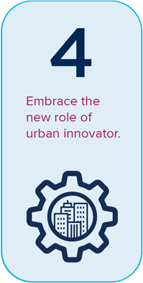 Embrace the new role of urban innovator. Urban areas, with their concentrated population and infrastructure, can use their density to generate and capture data that can fuel new ideas for transformative urban solutions and partnerships. As such, cities can and should adopt new roles that go beyond simply participating in PPPs—merely entering into concession, profit sharing, or lease agreements with private entities. Instead, they should think of themselves as charged with creating the innovation ecology in which unique partnerships for urban solutions can take shape. This move would involve adopting the role of facilitator and coordinator while developing the operational capacity to understand, cultivate, and manage such ecosystems.