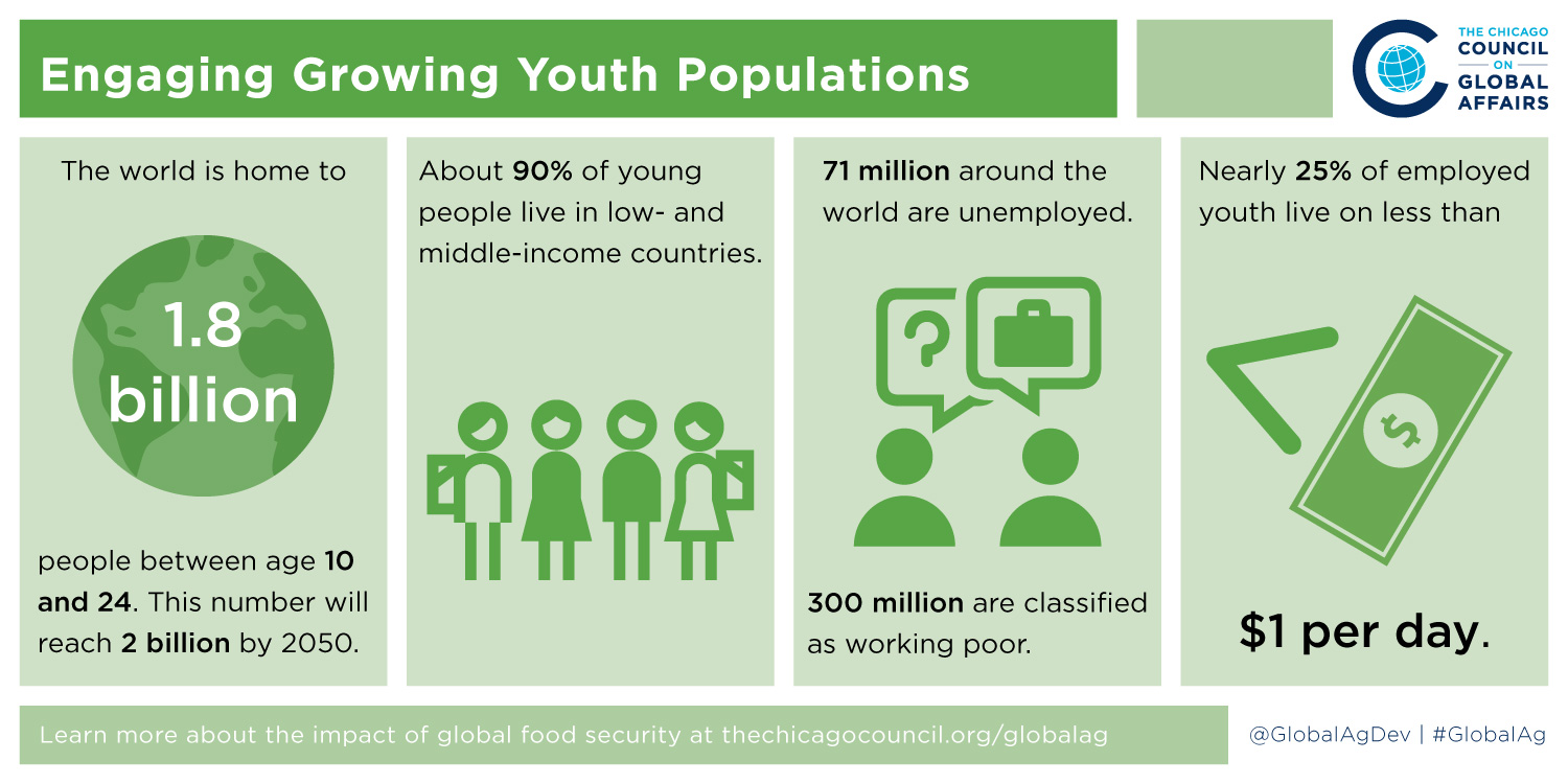 The international political and economic system is at an impasse. Existing and emerging security threats abound and durable solutions are often challenging to identify. Steadily increasing youth populations, rising unemployment, natural resource pressures, and unprecedented migration loom large as challenges that could further undermine progress in the coming years. However, historically, population booms have also provided fuel to accelerate development. Indeed, rates of poverty and food insecurity have held steady or declined in recent years, signaling potential to gain further momentum. Investments in agricultural development are not only instrumental to food and nutrition security, poverty alleviation, and broader economic development—they contribute to our collective desire to realize greater peace and security. How might food and nutrition security become a more central component to national security strategies? What might we do to plan and act in anticipation of evolving food security challenges in the face of continued demographic shifts and increased migration?